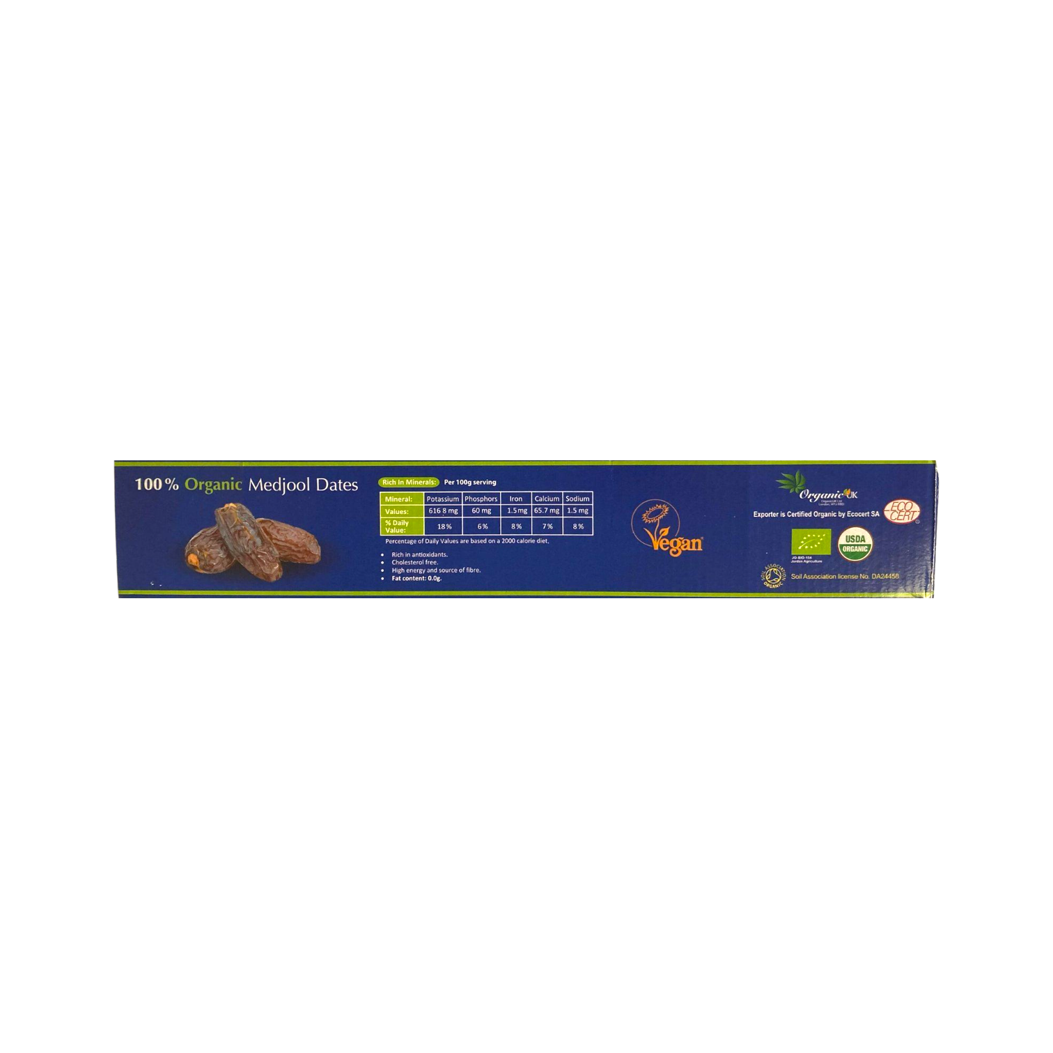 Our 100% Certified Organic Medjool Dates guarantee a honeyed flavour and juicy texture that does justice to the famed historical status of being the ‘King of Dates’. Jordanian farms produce tons and tons of these premium treats, all carefully hand-selected & packed under strict conditions to preserve optimal freshness. Naturally sweet, and rich in vitamins and minerals, our Organic Medjool Dates are amongst the world’s absolute finest. They are certified organic by The Soil Association, by The European Union and by USDA Organic.